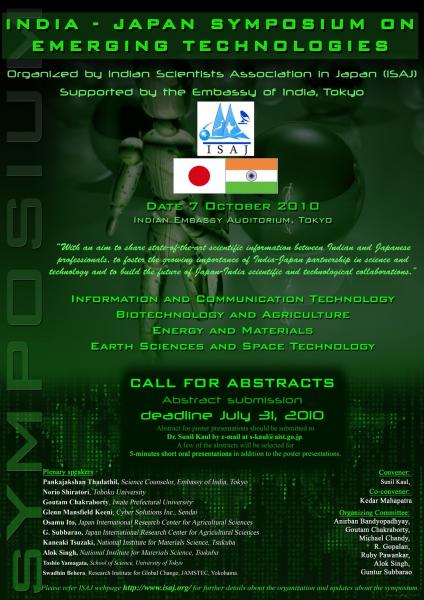 ISAJ has organized its first symposium “India - Japan Symposium On Emerging Technologies” on October 7th 2010 at the Indian Embassy Auditorium in Tokyo. Renowned scientists of Indian and Japanese origins presented the state of the art in four leading topics viz Information & Communication Technology, Biotechnology & Agriculture, Energy & Materials and Earth Sciences & Space Technology.